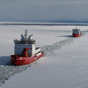 2025年12月5日,“雪龙2”号(前)在为“雪龙”号破冰引航。新华社发(陈栋彬 摄)