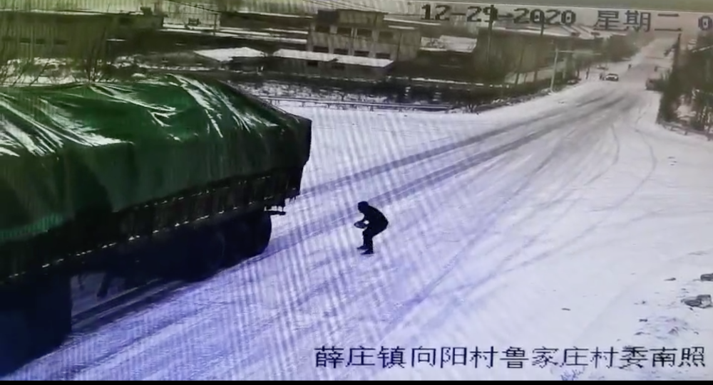 2020年12月29日,山東臨沂出現(xiàn)大雪降溫天氣,江蘇徐州一貨車在經(jīng)過費縣時,因積雪上坡道路結(jié)冰,司機(jī)緊急制動于事無補,車輛不斷下溜。