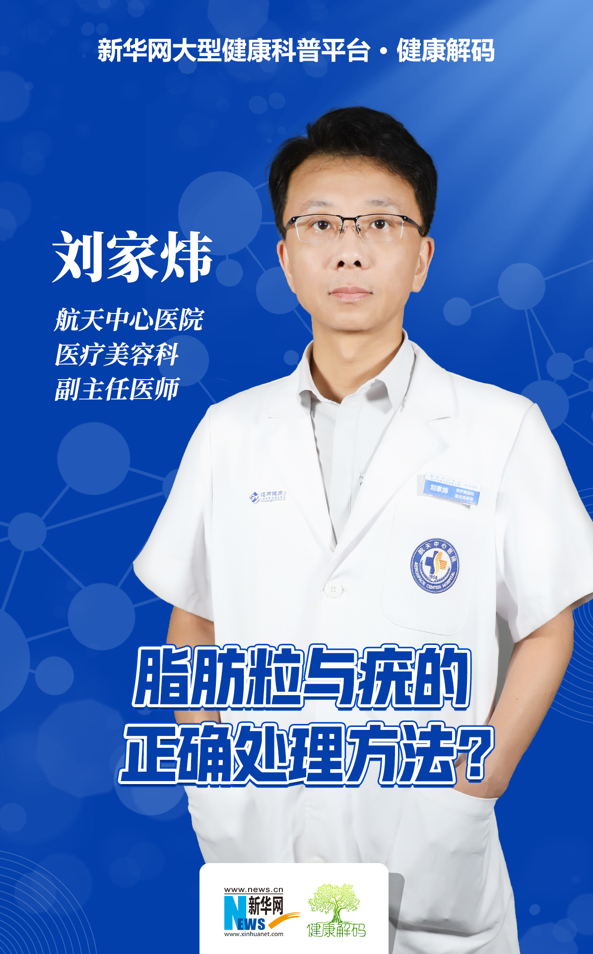 本集节目我们邀请了航天中心医院医疗美容科副主任医师刘家炜分享《脂肪粒与疣的正确处理方法》。