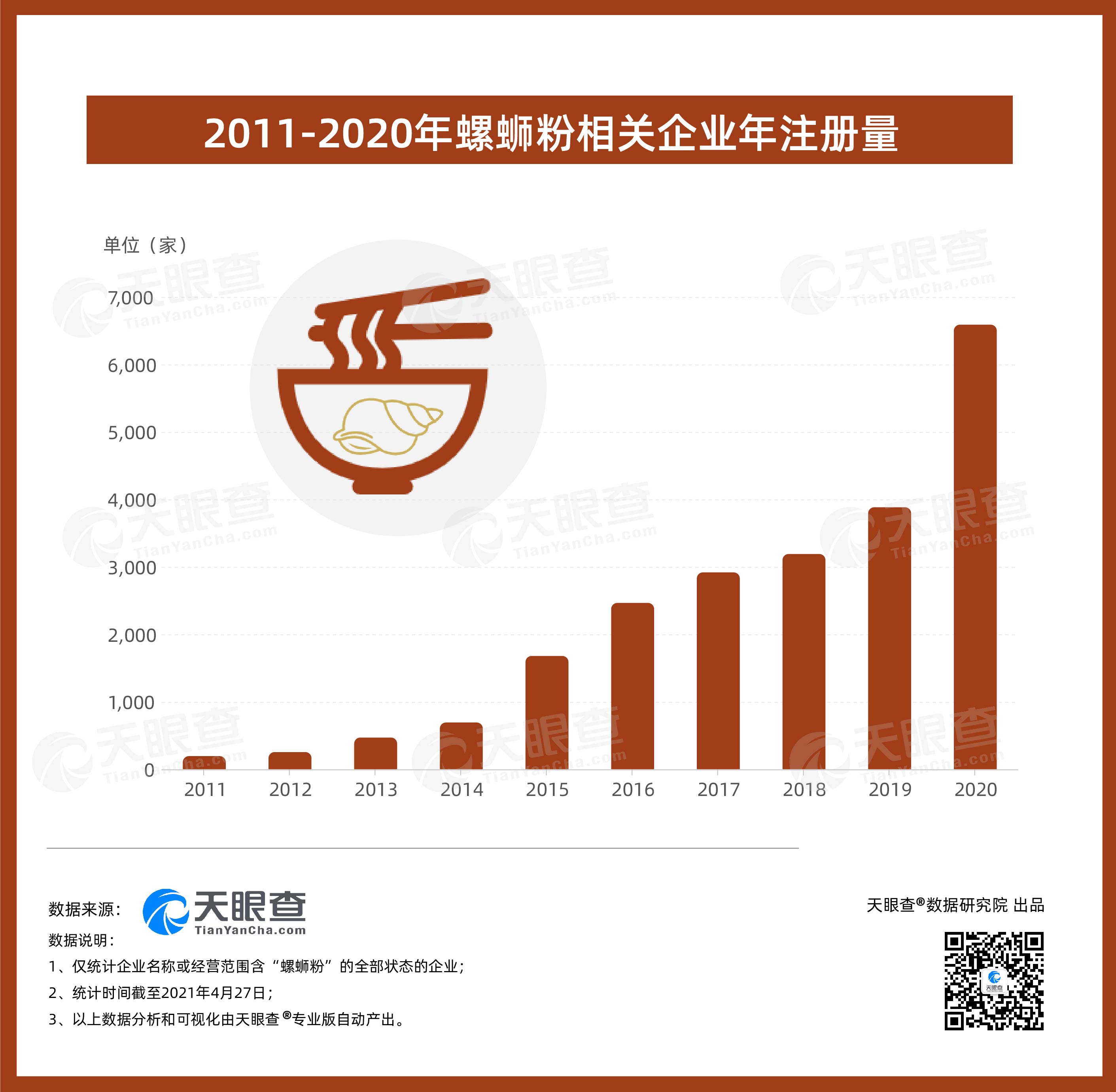 ????? 這碗起源于20世紀七八十年代夜市的地方小吃,如今是柳州最亮眼的新名片之一。從2014年底第一家袋裝螺螄粉企業(yè)誕生,到2020年產(chǎn)值超百億元,僅僅用了6年時間。袋裝螺螄粉如今遠銷海外20多個國家和地區(qū),約25萬個就業(yè)崗位遍布在全產(chǎn)業(yè)鏈各個環(huán)節(jié)。天眼查數(shù)據(jù)顯示,我國目前有超1.8萬家企業(yè)名稱或經(jīng)營范圍含“螺螄粉”,且狀態(tài)為在業(yè)、存續(xù)、遷入、遷出的螺螄粉相關(guān)企業(yè)。其中,近9成的相關(guān)企業(yè)注冊時間在5年之內(nèi)。