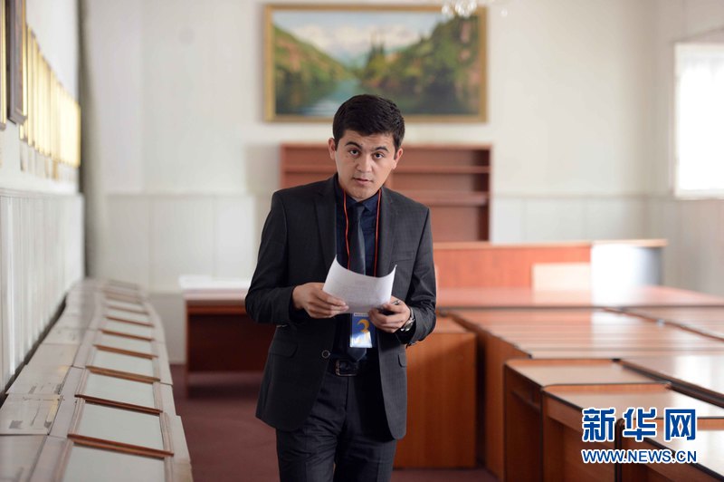 4月25日,烏茲別克斯坦塔什干國立東方學(xué)院大禮堂,世界經(jīng)濟與外交大學(xué)穆哈爾丁正在準(zhǔn)備參加比賽。