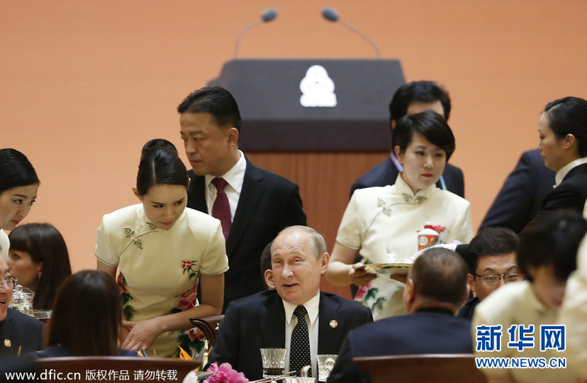 ??? 2014年5月20日,上海舉行亞洲相互協(xié)作與信任措施會議第四次峰會。俄羅斯總統(tǒng)弗拉迪米爾-普京出席2014上海亞信峰會歡迎晚宴,被美女禮儀服務(wù)小姐吸引。