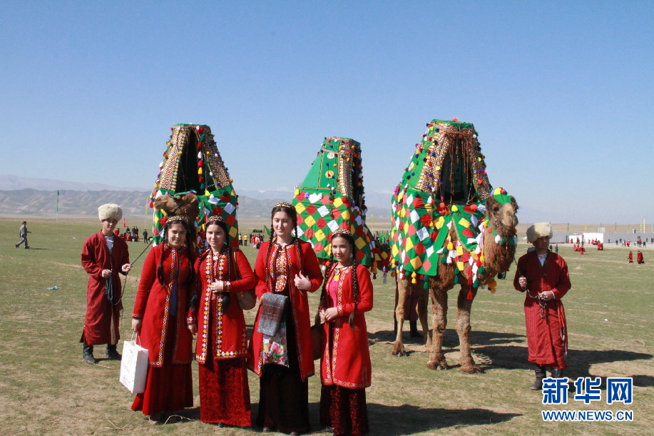 ????記者還看到過(guò)20來(lái)頭駱駝組成的駝群,其中頭駱身上綁著個(gè)布袋。駱駝低頭吃草,頭駝警覺(jué)地給它們站崗放哨。不一會(huì)兒,一些駱駝走到頭駝身前,向它施貼臉禮,頭駝一一回禮。當(dāng)記者試圖靠近時(shí),頭駝發(fā)出低沉的怪聲,群駝迅速抬起頭來(lái),慢慢地朝遠(yuǎn)方走去。在過(guò)節(jié)時(shí),牧民小伙穿上紅色條狀長(zhǎng)袍,頭戴白色羊羔皮帽,手牽的駱駝身上裹著人工織的毛毯,背上架著花轎,花轎中坐著美麗少女,少女頭戴小帽,梳著兩根長(zhǎng)辮,身穿蓋過(guò)腳面的長(zhǎng)裙。這是在給節(jié)日助興。同時(shí),這也是土庫(kù)曼斯坦民族婚禮中迎娶新娘的一個(gè)縮影。在現(xiàn)實(shí)生活中,城市人很少見到駱駝。于是在各種活動(dòng)中,跟打扮得如此漂亮的駱駝合影也是一件趣事。