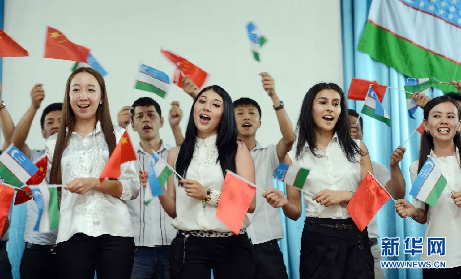 6月9日,學(xué)生代表在烏茲別克斯坦首都塔什干的烏世界語(yǔ)言大學(xué)禮堂表演節(jié)目。