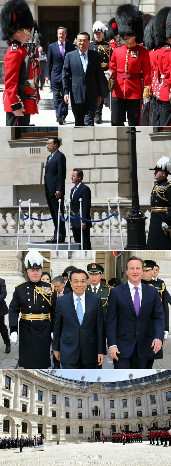 新華網(wǎng)北京6月17日電 據(jù)新華社“新國際”微博報(bào)道,當(dāng)?shù)貢r(shí)間17日中午,英國首相卡梅倫在英國財(cái)政部庭院內(nèi)為李克強(qiáng)總理舉行隆重的歡迎儀式。軍樂隊(duì)奏中英兩國國歌。李克強(qiáng)在卡梅倫的陪同下檢閱了儀仗隊(duì)。