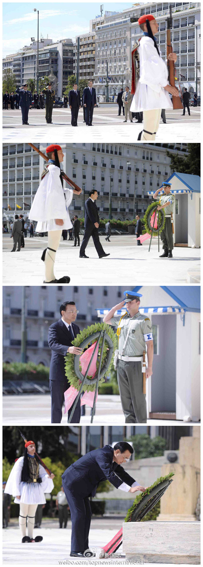 ??? 新華網(wǎng)北京6月20日電 據(jù)新華社“新國(guó)際”微博報(bào)道,正在希臘訪問的李克強(qiáng)總理19日向希臘無名戰(zhàn)士紀(jì)念碑獻(xiàn)花圈。該紀(jì)念碑1932年建成,碑上鐫刻公元前5世紀(jì)希臘政治家伯里克利斯一篇悼詞中的兩句名言:“全世界杰出戰(zhàn)士之墓”、“安放無名氏的床第”,及希臘從上世紀(jì)初到五十年代與外國(guó)交戰(zhàn)的戰(zhàn)役名稱和地名。
