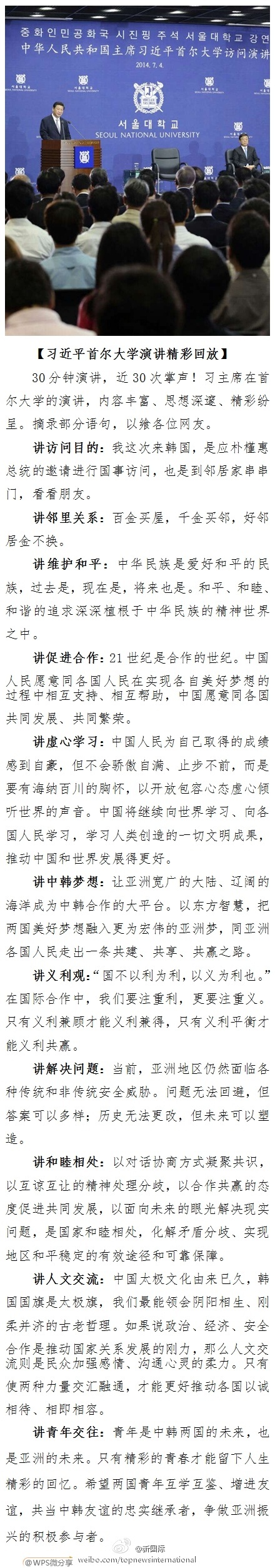 ???? 新華網(wǎng)北京7月4日電 據(jù)新華社“新國際”微博報道,30分鐘演講,近30次掌聲!習(xí)主席在首爾大學(xué)的演講,內(nèi)容豐富、思想深邃、精彩紛呈。摘錄部分語句,以饗各位網(wǎng)友。