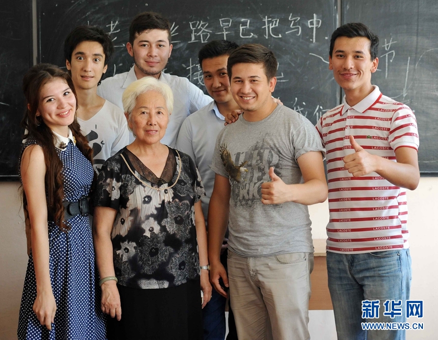 ??? 6月25日,烏茲別克斯坦首都塔什干,烏國立世界語言大學(xué)教室,70歲的董富華在向三年級學(xué)生上漢語課。新華網(wǎng)記者 沙達(dá)提攝。