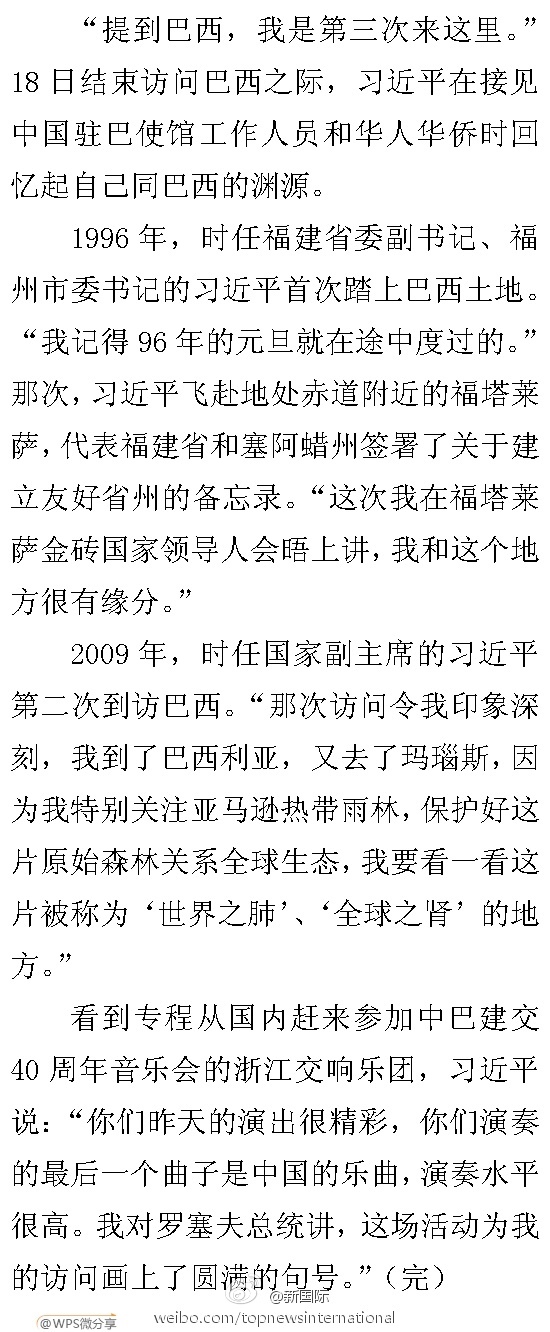 新華網(wǎng)北京7月19日電? 據(jù)新華社“新國際”微博報(bào)道,“提到巴西,我是第三次來這里?!?8日結(jié)束訪問巴西之際,習(xí)近平在接見中國駐巴使館工作人員和華人華僑時(shí)回憶起自己同巴西的淵源。
