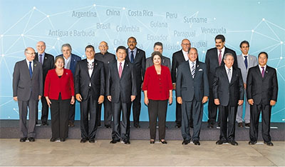 ? 當(dāng)?shù)貢r(shí)間7月17日下午,中國—拉美和加勒比國家領(lǐng)導(dǎo)人會(huì)晤在巴西利亞舉行。本次會(huì)晤由中方倡議,中國國家主席習(xí)近平、巴西總統(tǒng)羅塞夫、哥斯達(dá)黎加總統(tǒng)索利斯、古巴國務(wù)委員會(huì)主席兼部長會(huì)議主席勞爾·卡斯特羅、厄瓜多爾總統(tǒng)科雷亞、蘇里南總統(tǒng)鮑特塞、哥倫比亞總統(tǒng)桑托斯、智利總統(tǒng)巴切萊特、圭亞那總統(tǒng)拉莫塔爾、烏拉圭總統(tǒng)穆???、委內(nèi)瑞拉總統(tǒng)馬杜羅、安提瓜和巴布達(dá)總理布朗等出席。