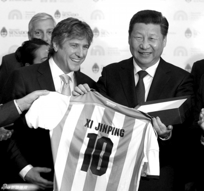 ????在和阿根廷副總統(tǒng)兼參議長(zhǎng)布杜及眾議長(zhǎng)多明格斯舉行會(huì)談時(shí),習(xí)近平特別提到阿根廷足球隊(duì)在世界杯奪得亞軍,他說(shuō):“剛才眾議長(zhǎng)先生問(wèn)我是否喜歡足球,我說(shuō)我非常喜歡足球。他也祝愿中國(guó)能夠早日舉辦一屆世界杯,這正是我的愿望。但是我們足球的發(fā)展,還希望同阿根廷加強(qiáng)交流合作,靠你們的幫助,提高我們的水平?!?/p>