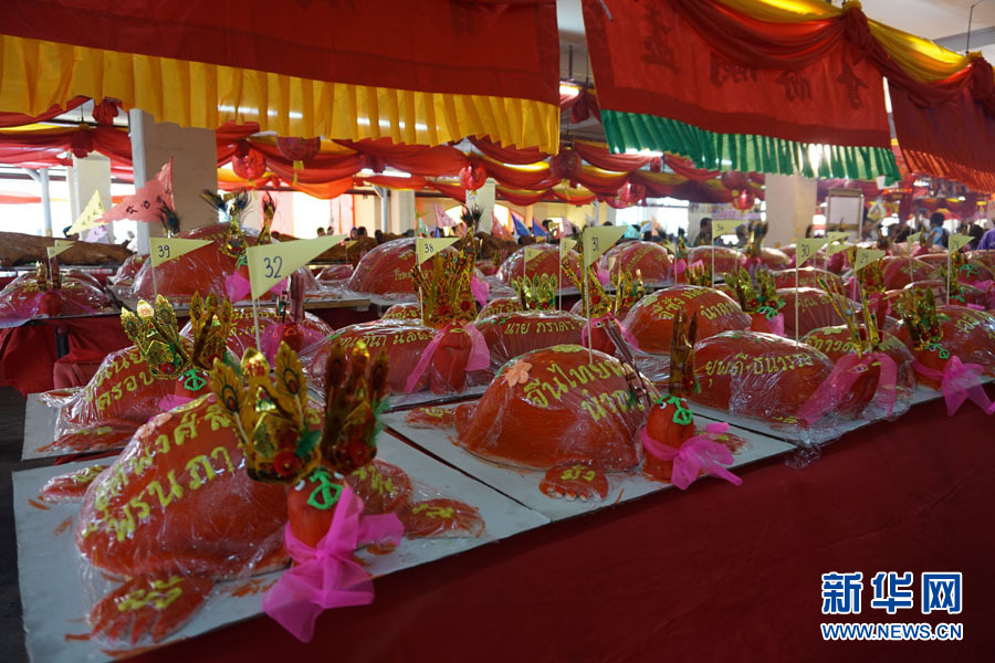 ????8月12日,泰國普吉府舉辦中國傳統(tǒng)的“中元普渡”活動,以普渡孤魂,表達仁愛和孝道思想。該活動在普吉已有150多年的歷史,每逢中國農(nóng)歷7月,當?shù)厝A人便會舉行祭祀儀式,用面粉和糖制成大小不一的紅色面團,裝飾成烏龜形狀,既表達了對于祖先的懷念,還傳遞了對于全家人健康長壽的祝福。圖為活動中用于祭祀的烏龜形狀糕點。新華網(wǎng)記者 楊云燕 攝