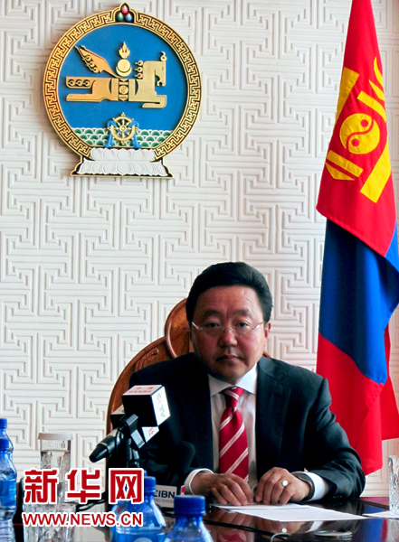 ??? 8月15日,蒙古國(guó)總統(tǒng)額勒貝格道爾吉在烏蘭巴托接受中國(guó)新聞代表團(tuán)的聯(lián)合采訪。新華社記者馮堅(jiān)攝