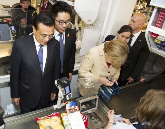 在超市的入口,默克爾拿起了一個(gè)提籃,轉(zhuǎn)頭對(duì)李克強(qiáng)總理說(shuō):“你不用拿了,我們用一個(gè)就行?!?/p>