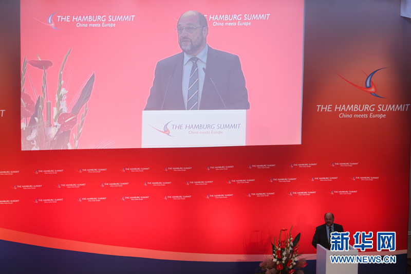 ??? 10月11日,在德國漢堡舉行的中歐論壇漢堡峰會上,歐洲議會主席馬丁?舒爾茨發(fā)言。中歐論壇漢堡峰會第六屆會議11日在德國漢堡閉幕。本屆峰會以“中國與歐洲相遇”為主題。來自中歐政治、經(jīng)濟(jì)和學(xué)術(shù)界的500多位代表聚集在一起,探討中歐經(jīng)貿(mào)合作未來趨勢、中國經(jīng)濟(jì)的綠色發(fā)展等重要議題。新華社記者張帆攝