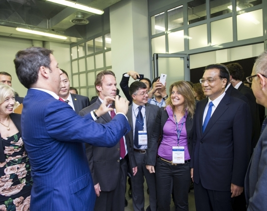 今天的活動(dòng)中,克強(qiáng)總理結(jié)束致辭離開(kāi)會(huì)場(chǎng)時(shí),正好從董柔心身旁走過(guò)。她抓住時(shí)機(jī),用中文同克強(qiáng)總理打招呼。這招也成功地引起了克強(qiáng)總理的注意??藦?qiáng)總理不僅夸她中文說(shuō)得不錯(cuò),還欣然應(yīng)允了合影的要求。一旁的倫齊連忙“貼心地”拿過(guò)董柔心的手機(jī),幫他倆拍下了合影。