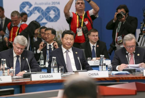 ????(圖為2014年11月15日,二十國集團(tuán)領(lǐng)導(dǎo)人第九次峰會在澳大利亞布里斯班舉行。國家主席習(xí)近平出席會議并發(fā)表題為《推動創(chuàng)新發(fā)展 實(shí)現(xiàn)聯(lián)動增長》的重要講話。新華社發(fā))