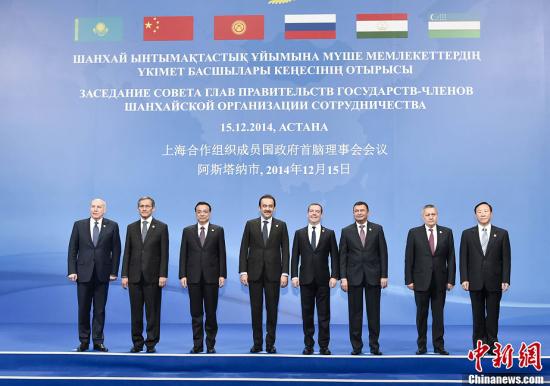 ???? 12月15日,中國國務(wù)院總理李克強(qiáng)在阿斯塔納出席上海合作組織成員國政府首腦理事會第十三次會議。這是與會各國代表團(tuán)團(tuán)長集體合影。中新社記者 劉震 攝