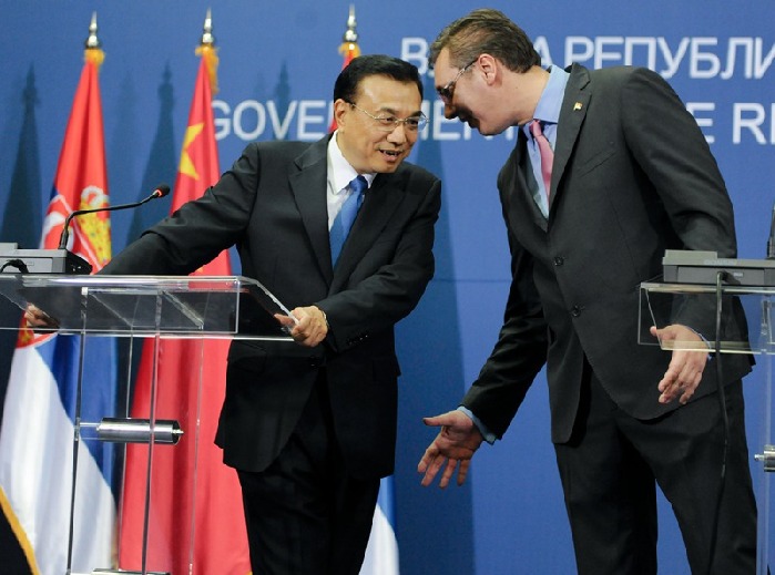 李克強(qiáng)與塞爾維亞總理武契奇共見記者。中新社 劉震 攝
