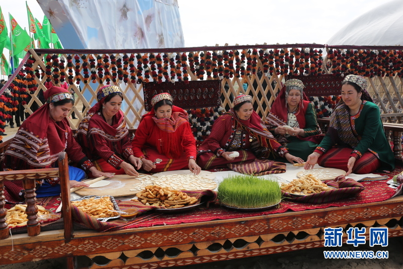 ????以往過著游牧和半游牧生活的人們?cè)诒┫?、牲畜產(chǎn)仔的時(shí)節(jié),都會(huì)以這一傳統(tǒng)佳節(jié)歡慶新生活。 21日上午,在阿什哈巴德以東40來公里處專門為節(jié)日搭建的場(chǎng)地上,土庫曼斯坦內(nèi)閣、外交使節(jié)、民眾和學(xué)生參加了隆重的慶?;顒?dòng)。活動(dòng)中,青年男女、學(xué)齡前兒童載歌載舞,民眾和藝術(shù)家展示傳統(tǒng)的編織和手工藝術(shù),青年男女高高地蕩起秋千,汗血寶馬進(jìn)行馬技表演,土庫曼咬狼犬、羊群和駱駝或圍在欄子里,或被主人牽在手中,展現(xiàn)出游牧民族的生活景象。