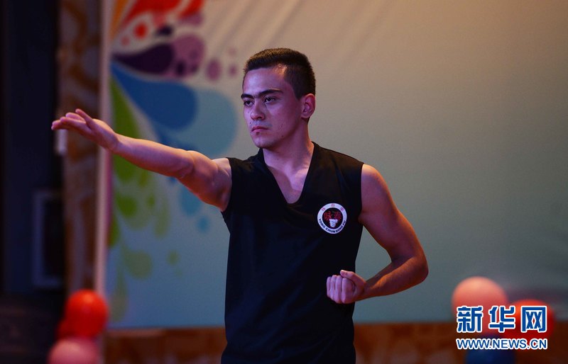 4月28日,在烏內(nèi)務(wù)部文化宮禮堂,來(lái)自烏茲別克斯坦世界語(yǔ)言大學(xué)的DJAVDAT(中文名:張睿)在參加比賽。新華網(wǎng)記者 沙達(dá)提攝
