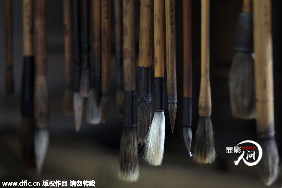 2015年2月24日,中國(guó)江蘇南京的一間公寓里,王錚(音譯)父親使用的毛筆懸掛在那里蒙上一層灰很久沒(méi)人使用。他的父親在馬航MH370事件中失聯(lián)無(wú)消息。