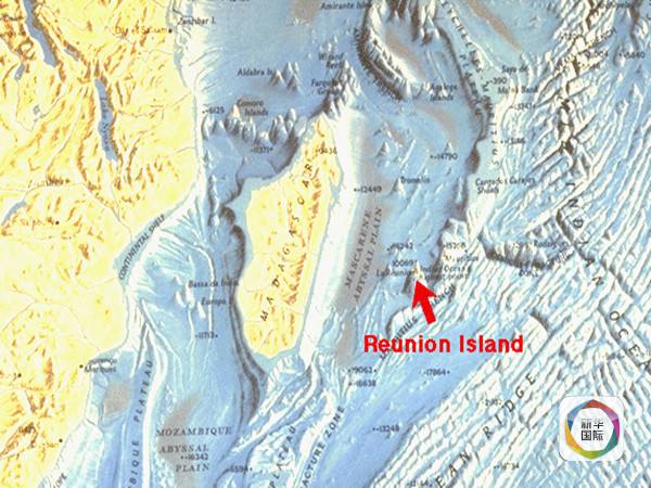 (留尼汪島附近的印度洋海底地形圖,紅色箭頭所指的為留尼汪島,圖上可見大面積隆起的海脊)