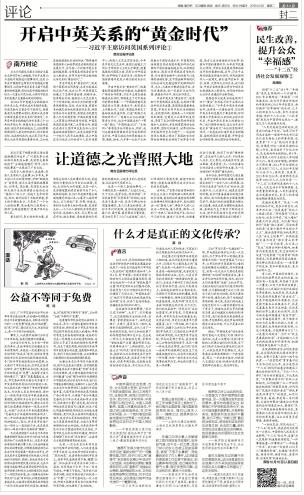 英國駐華大使吳百納連續(xù)用了四個“黃金”來形容習(xí)近平主席此次訪英的意義:“今年是中英關(guān)系的黃金年,這將是一次黃金訪問,它證明中英關(guān)系的發(fā)展處于黃金時期。訪問將確立中英面向21世紀(jì)的全球伙伴關(guān)系,開啟中英關(guān)系史上的黃金10年?!蔽覀兤诖⑾嘈?,這次為開啟中英關(guān)系“黃金時代”而往的里程碑式訪問,一定能成功打造中英關(guān)系新格局、繪制兩國關(guān)系新藍(lán)圖、開辟務(wù)實合作新前景、樹立國際合作新典范。(南方日報評論員)