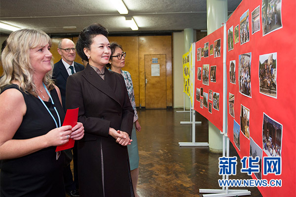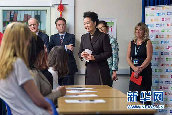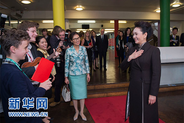 在英國教育部國務(wù)大臣吉布、學(xué)校校長等陪同下,彭麗媛觀看學(xué)生們用中文進行的才藝表演,參觀學(xué)校成果展,觀摩中文課,與女學(xué)生們互動交流,并向?qū)W校贈送中國文化及漢語學(xué)習(xí)類圖書及音像制品。