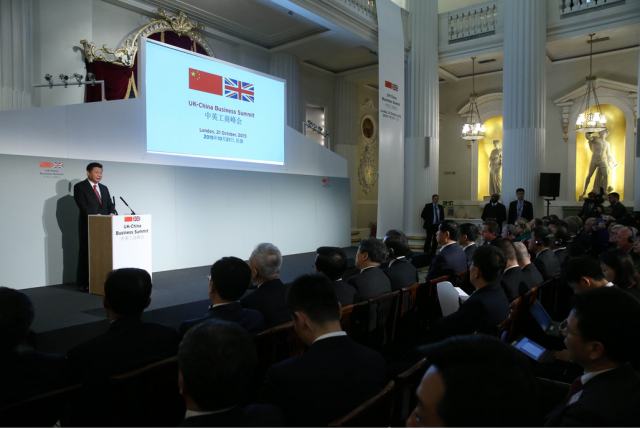 10月21日,國家主席習近平和英國首相卡梅倫共同出席在倫敦金融城舉行的中英工商峰會并致辭。(新華社記者龐興雷攝)