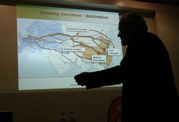 ↑投影顯示目前從中國(guó)聯(lián)通歐洲大陸的幾條鐵路線。