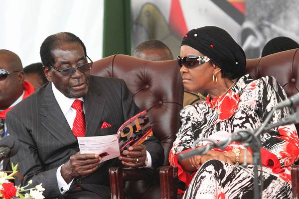 2015年2月28日,津巴布韋總統(tǒng)穆加貝與夫人格蕾絲在民眾為穆加貝舉行的91歲生日大型慶典上翻閱小冊子。新華社發(fā)(費列蒙攝)