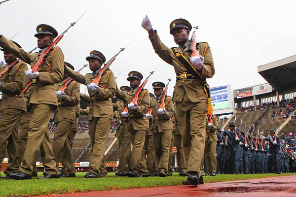 2015年4月18日,在中國(guó)援建的津巴布韋國(guó)家體育場(chǎng)內(nèi),津國(guó)防軍進(jìn)行表演。(新華社發(fā),費(fèi)列蒙攝)