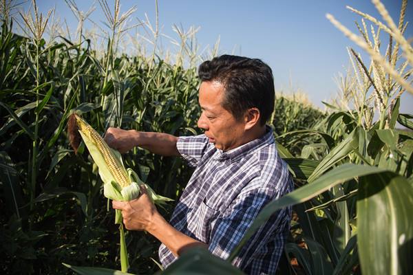 2015年11月11日,在津巴布韋奇諾伊的溫亞尼農(nóng)場(chǎng)上,中方企業(yè)晥津公司總經(jīng)理何宏順展示農(nóng)場(chǎng)出品的青玉米。(新華社記者許林貴攝)