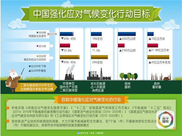 今年6月,中國正式向聯(lián)合國提交2020年后應(yīng)對氣候變化的“國家自主決定貢獻(xiàn)”:二氧化碳排放2030年左右達(dá)到峰值并爭取盡早實(shí)現(xiàn),單位國內(nèi)生產(chǎn)總值二氧化碳排放比2005年下降60%至65%,非化石能源占一次能源消費(fèi)比重達(dá)到20%左右,森林蓄積量比2005年增加45億立方米左右。