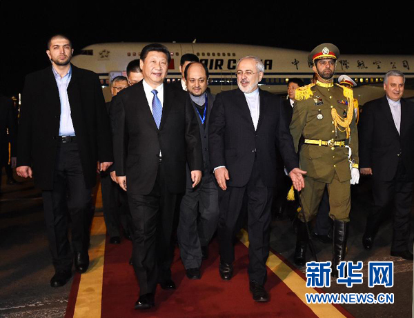 圖為1月22日,國家主席習(xí)近平乘專機(jī)抵達(dá)伊朗首都德黑蘭,開始對伊朗進(jìn)行國事訪問。這是在梅赫拉巴德機(jī)場,習(xí)近平受到伊朗外交部長扎里夫等熱情迎接。(新華社記者饒愛民攝)