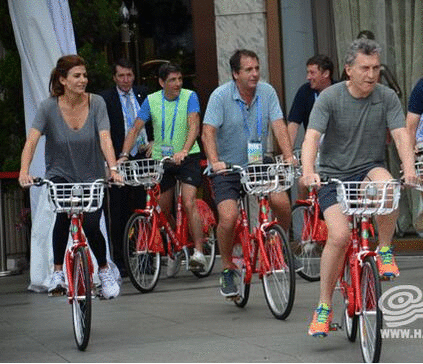 阿根廷總統(tǒng)馬克里在岸邊騎杭州公共自行車