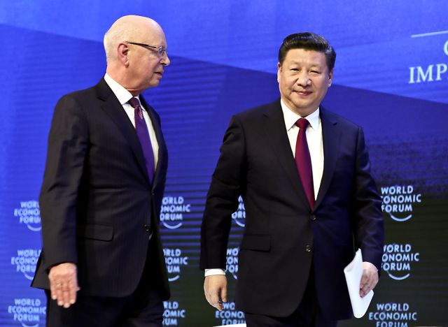 1月17日,國家主席習近平在瑞士達沃斯國際會議中心出席世界經(jīng)濟論壇2017年年會開幕式,并發(fā)表題為《共擔時代責任 共促全球發(fā)展》的主旨演講。這是習近平同世界經(jīng)濟論壇創(chuàng)始人兼執(zhí)行主席施瓦布在一起。(新華社記者蘭紅光攝)