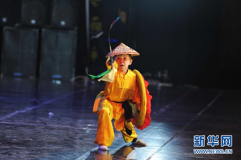 1月18日晚,烏茲別克斯坦首都塔什干人民友誼宮,烏茲別克斯坦中華民族文化中心武術(shù)隊隊員在表演武術(shù)。