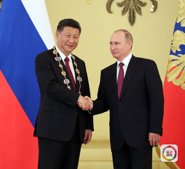 7月4日,國家主席習近平在莫斯科克里姆林宮同俄羅斯總統(tǒng)普京舉行會談。這是會談后,普京向習近平授予俄羅斯國家最高勛章“圣安德烈”勛章。新華社記者 劉衛(wèi)兵 攝