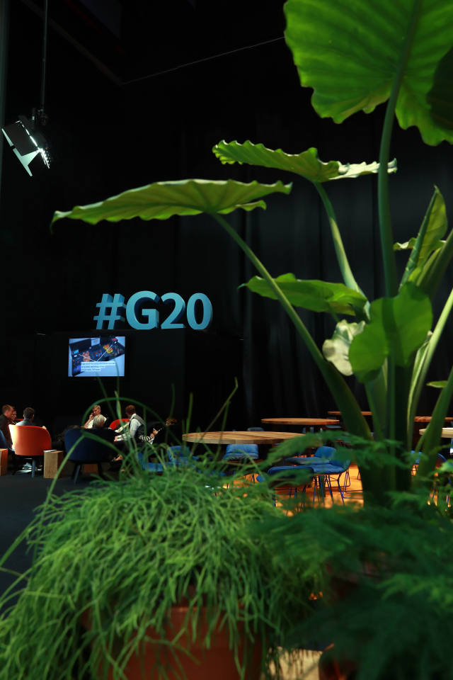 ↑這是7月6日在德國漢堡拍攝的G20領(lǐng)導(dǎo)人峰會(huì)國際新聞中心內(nèi)擺放的植物。新華社記者羅歡歡攝