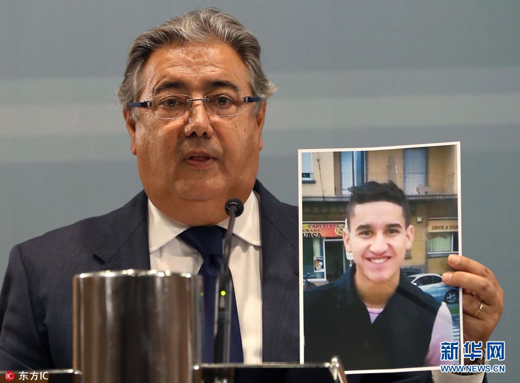 當?shù)貢r間2017年8月21日,西班牙內(nèi)政部長展示巴塞羅恐襲案嫌犯照片,尤尼斯·阿布雅各布。