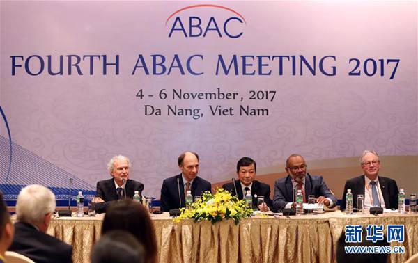 11月6日,在越南峴港,APEC工商咨詢理事會成員代表出席記者會。2017亞太經(jīng)合組織(APEC)工商咨詢理事會成員6日表示,中國經(jīng)濟發(fā)展對APEC區(qū)域經(jīng)濟發(fā)展至關重要,期待中國智慧在推動區(qū)域經(jīng)濟一體化方面發(fā)揮更大作用。新華社記者李鵬攝