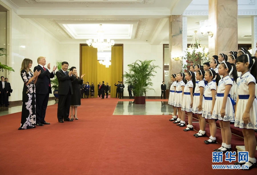 11月9日,國家主席習(xí)近平在北京人民大會堂東門外廣場舉行歡迎儀式,歡迎美利堅合眾國總統(tǒng)唐納德·特朗普對中國進(jìn)行國事訪問。這是習(xí)近平和夫人彭麗媛同特朗普夫婦在人民大會堂欣賞文藝表演。新華社記者 李學(xué)仁 攝