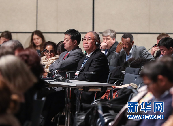 11月18日,在德國(guó)波恩,中國(guó)代表團(tuán)團(tuán)長(zhǎng)、中國(guó)氣候變化事務(wù)特別代表解振華(中右)出席閉幕會(huì)議。新華社記者 單宇琦 攝