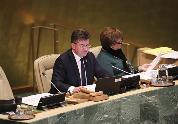 12月21日,在位于紐約的聯(lián)合國總部,第72屆聯(lián)合國大會主席萊恰克(左)主持聯(lián)合國大會緊急會議。新華社記者王迎攝