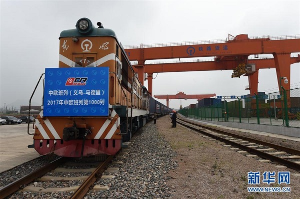 5月13日,2017年第1000列中歐班列從義烏西站駛出。當(dāng)日,X8024次中歐班列(義烏-馬德里)從浙江義烏鐵路西站鳴笛駛出。這列滿載小商品、服裝等貨物的列車是2017年開行的第1000列中歐班列。中國鐵路總公司統(tǒng)計(jì)顯示,2017年中歐班列開行數(shù)量較去年同期增加612列,增長158%。新華社發(fā)(龔獻(xiàn)明 攝)