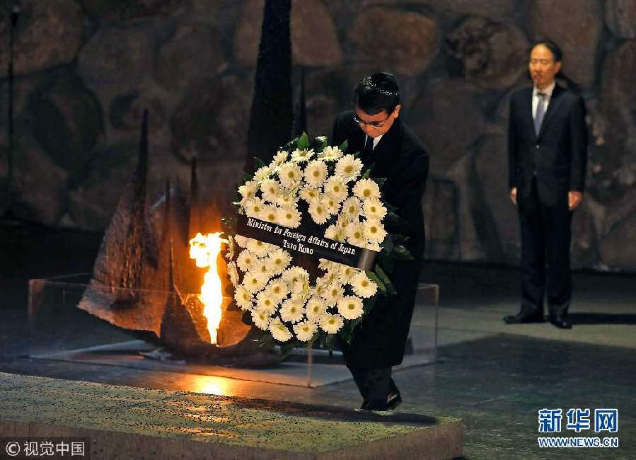 12月25日,耶路撒冷,日本外相河野太郎訪問耶路撒冷,參觀大屠殺紀(jì)念館,獻花悼念死難者。 (圖片來源:視覺中國)