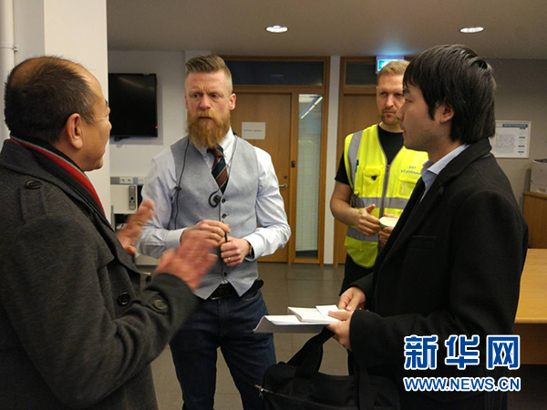 12月27日,在冰島雷克雅未克,中國(guó)駐冰島大使館工作人員與冰島國(guó)家救援中心人員交談。新華社發(fā)