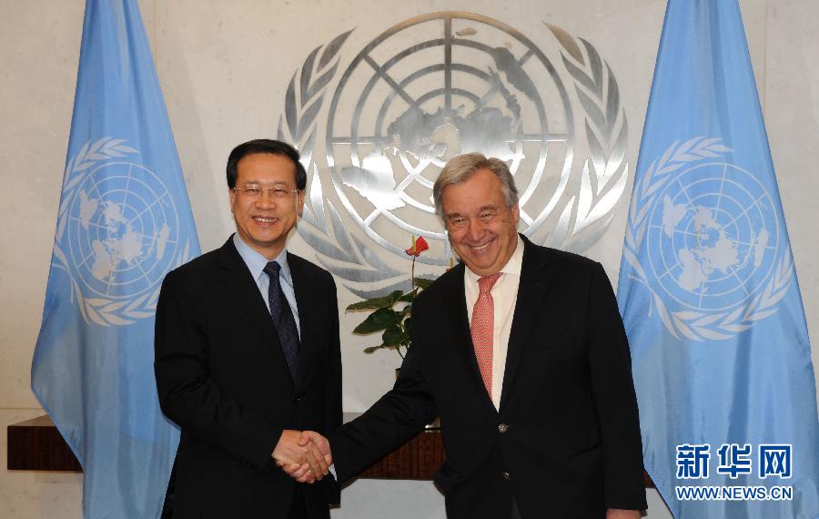 1月30日,在美國紐約,中國新任常駐聯(lián)合國代表馬朝旭(左)與聯(lián)合國秘書長古特雷斯握手。中國新任常駐聯(lián)合國代表馬朝旭30日說,中囯將同囯際社會(huì)一道,共同努力推動(dòng)聯(lián)合國為維護(hù)世界和平、促進(jìn)共同發(fā)展發(fā)揮更大作用。新華社記者馬建國攝